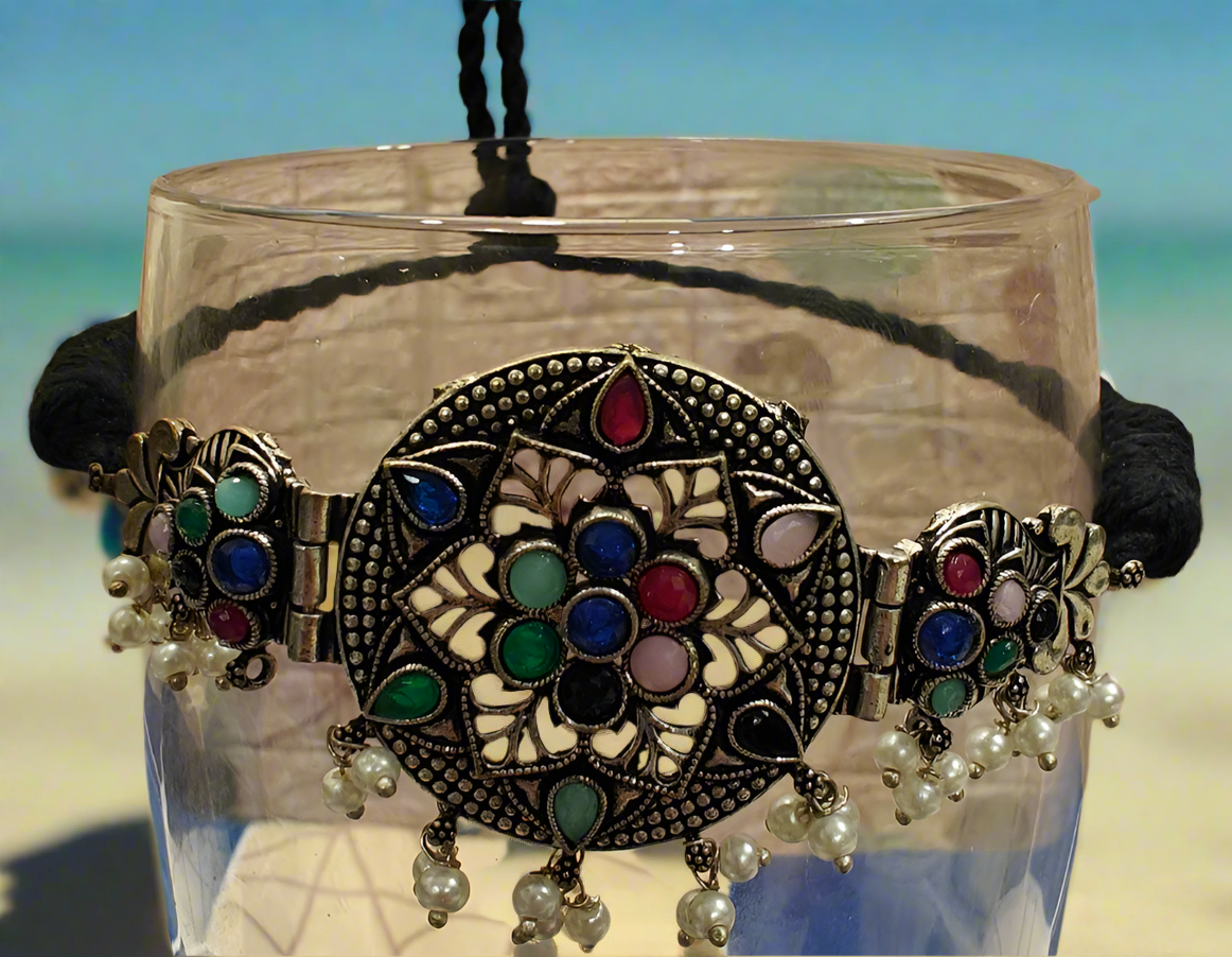 Unleash fierce elegance with our Sayara-inspired sterling choker. Adorned with vibrant stones and classic silver finish, this masterpiece is made to slay any desi look. Whether it’s a festival or a function, this choker ensures all eyes are on you.